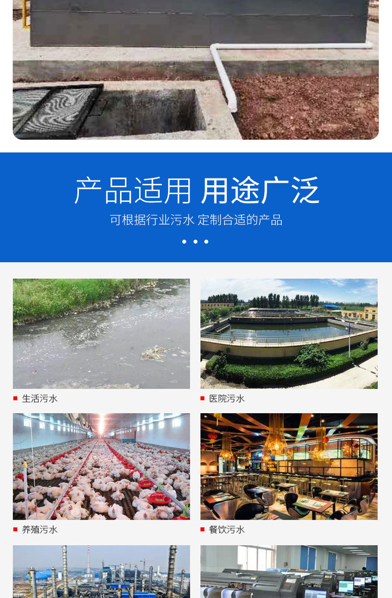 地埋式污水處理設(shè)備:采用生物處理工藝,將設(shè)備埋設(shè)于地下,具有占地面積小、噪音低、運(yùn)行穩(wěn)定等特點(diǎn)。廣泛應(yīng)用于居住小區(qū)、醫(yī)院、學(xué)校等場(chǎng)所。