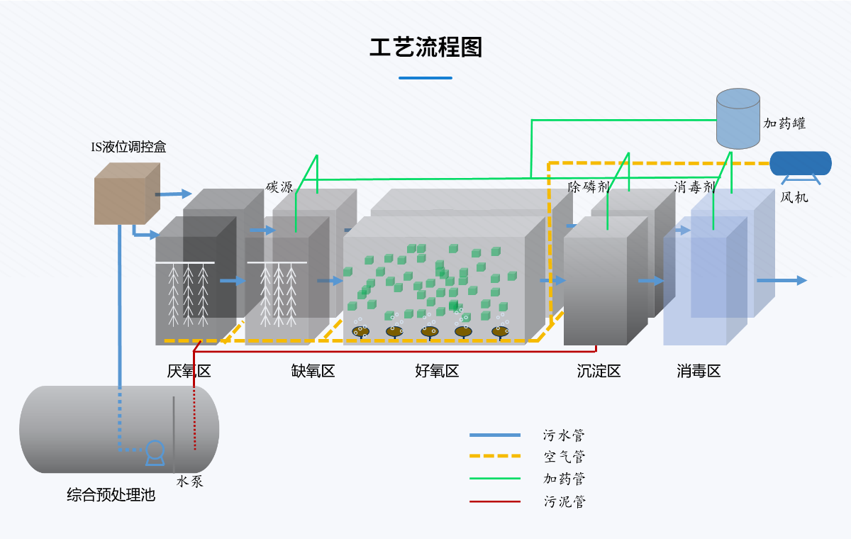1. 調(diào)節(jié)池:液位控制器聯(lián)動污水提升泵,低液位(0.5m)停泵,高液位(1.4m)報警,中液位(1.0m